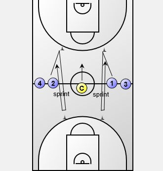 With the command of the coach, the 1st group comes to the free throw line by making a close out, comes quickly to the corner of the field line together with the stance and is asked to sprint to the half court.